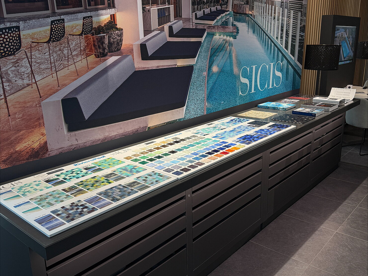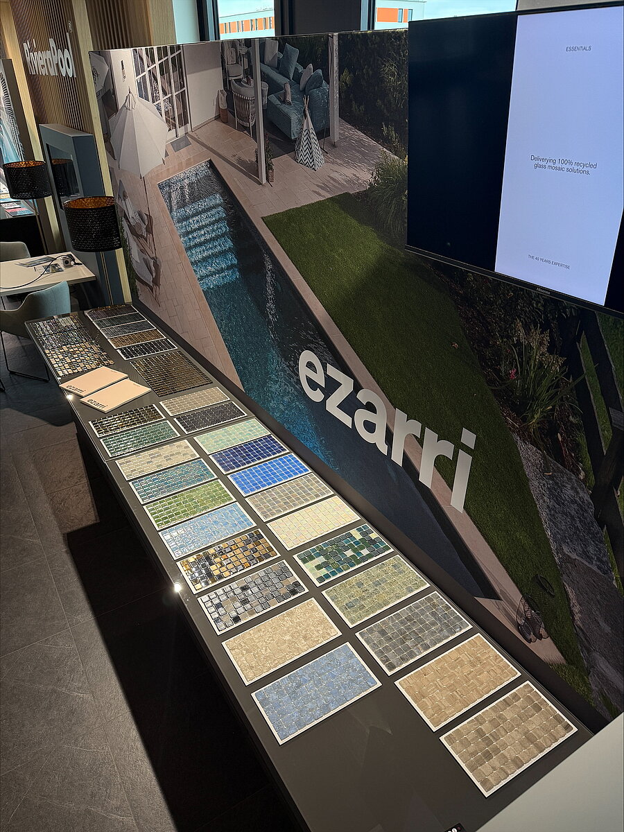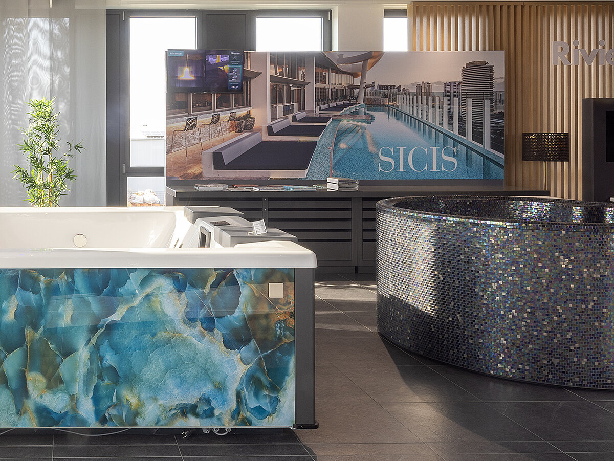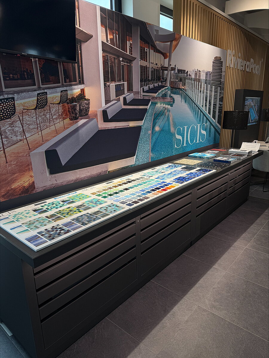 In unserer Ausstellung in Berlin präsentieren wir exklusive Mosaike von SICIS – handgefertigte Designstücke aus Italien, bekannt für höchste Qualität, kunstvolle Oberflächen und luxuriöse Farbwelten. Am Musterschrank entdecken Sie die Vielfalt der Kollektionen live, vergleichen Materialien und finden das perfekte Mosaik für Ihr individuelles Pool- oder Spa-Projekt.